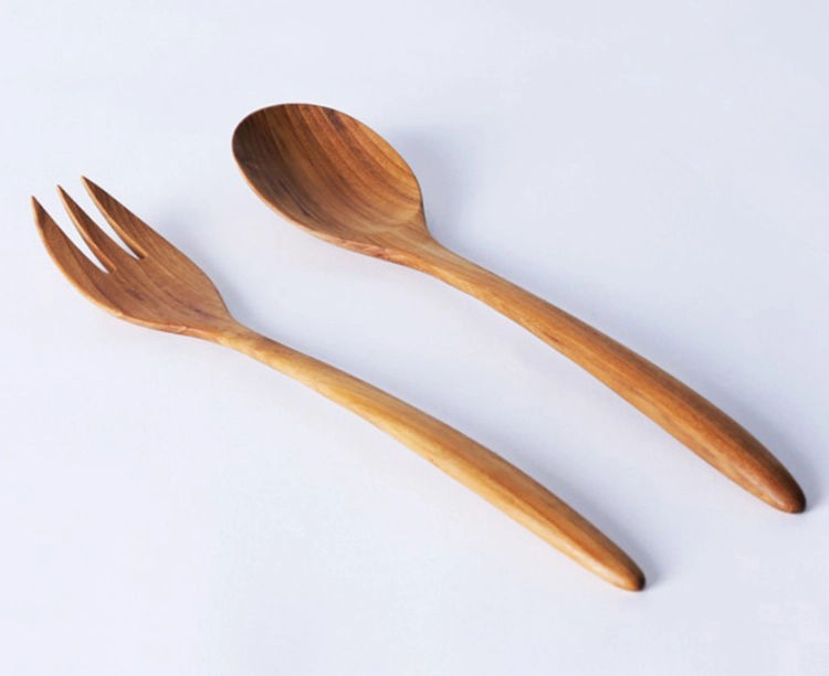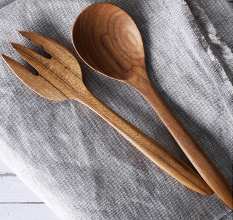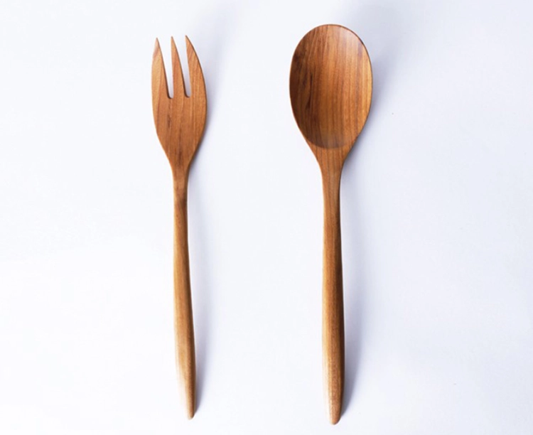 작은 샐러드 그릇에 어울리는 천연 티크 목재의 나무 포크&스푼이에요.