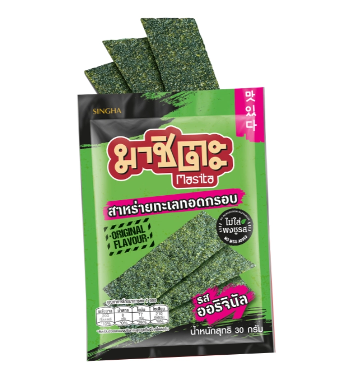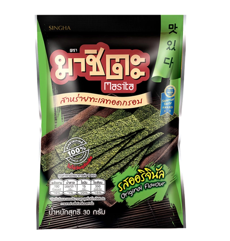 한국에서는 김을 반찬으로 먹지만 태국에서는 김을 과자로 먹어요! 밥이랑 먹지 않아도 되는 태국 싱하 브랜드의 마시타 김과자를 드셔보세요.
